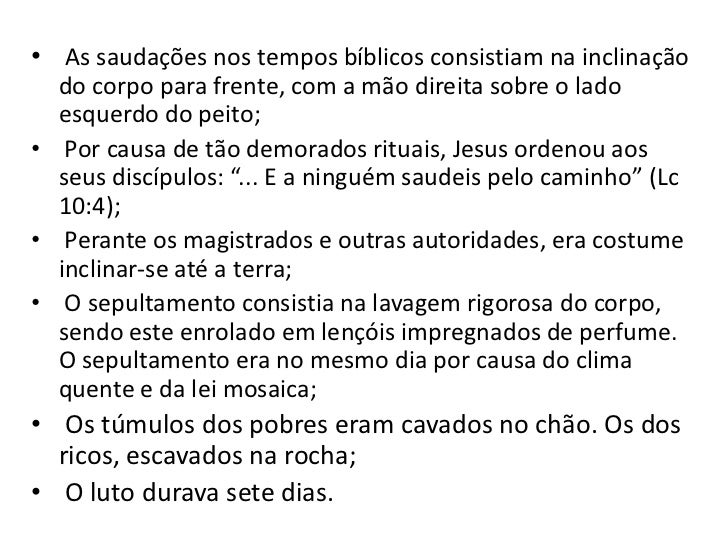 132. 132. • As saudações nos tempos bíblicos consistiam na inclinação do corpo para frente, com a mão direita sobre o lado esquerdo do peito;• Por causa de tão demorados rituais, Jesus ordenou aos seus discípulos: “... E a ninguém saudeis pelo caminho” (Lc 10:4);• Perante os magistrados e outras autoridades, era costume inclinar-se até a terra;• O sepultamento consistia na lavagem rigorosa do corpo, sendo este enrolado em lençóis impregnados de perfume. O sepultamento era no mesmo dia por causa do clima quente e da lei mosaica;• Os túmulos dos pobres eram cavados no chão. Os dos ricos, escavados na rocha;• O luto durava sete dias.