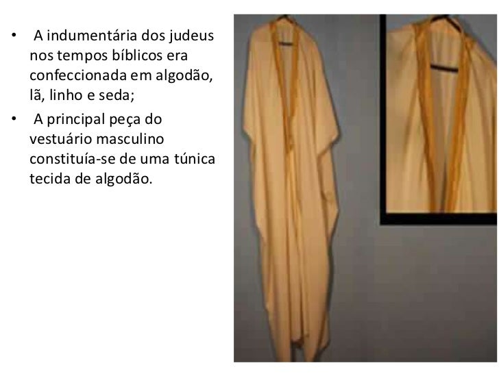 133. 133. • A indumentária dos judeus nos tempos bíblicos era confeccionada em algodão, lã, linho e seda;• A principal peça do vestuário masculino constituía-se de uma túnica tecida de algodão.
