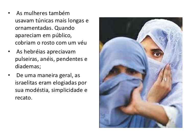 135. 135. • As mulheres também usavam túnicas mais longas e ornamentadas. Quando apareciam em público, cobriam o rosto com um véu• As hebréias apreciavam pulseiras, anéis, pendentes e diademas;• De uma maneira geral, as israelitas eram elogiadas por sua modéstia, simplicidade e recato.