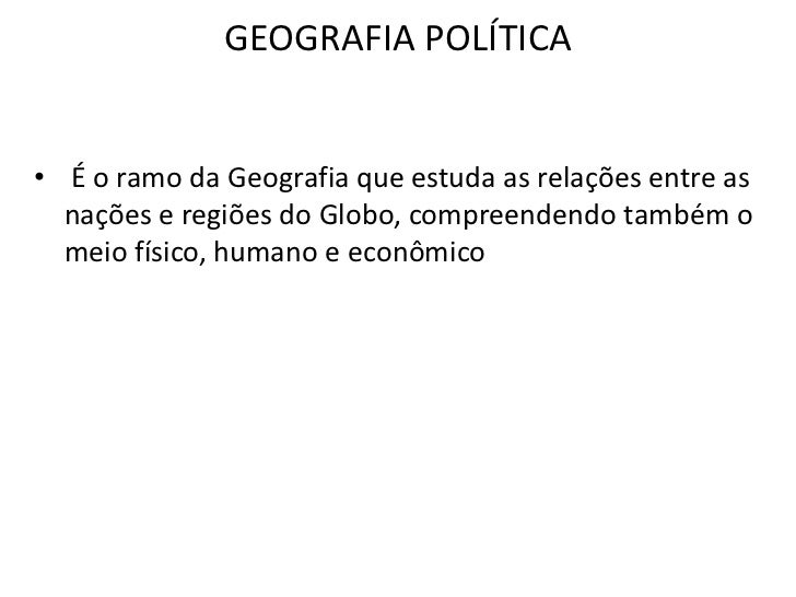 136. 136. GEOGRAFIA POLÍTICA• É o ramo da Geografia que estuda as relações entre as nações e regiões do Globo, compreendendo também o meio físico, humano e econômico