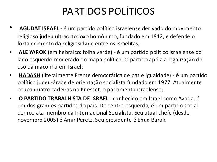 137. 137. PARTIDOS POLÍTICOS• AGUDAT ISRAEL - é um partido político israelense derivado do movimento religioso judeu ultraortodoxo homônimo, fundado em 1912, e defende o fortalecimento da religiosidade entre os israelitas;• ALE YAROK (em hebraico: folha verde) - é um partido político israelense do lado esquerdo moderado do mapa político. O partido apóia a legalização do uso da maconha em Israel;• HADASH (literalmente Frente democrática de paz e igualdade) - é um partido político judeu-árabe de orientação socialista fundado em 1977. Atualmente ocupa quatro cadeiras no Knesset, o parlamento israelense;• O PARTIDO TRABALHISTA DE ISRAEL - conhecido em Israel como Avoda, é um dos grandes partidos do país. De centro-esquerda, é um partido social- democrata membro da Internacional Socialista. Seu atual chefe (desde novembro 2005) é Amir Peretz. Seu presidente é Ehud Barak.