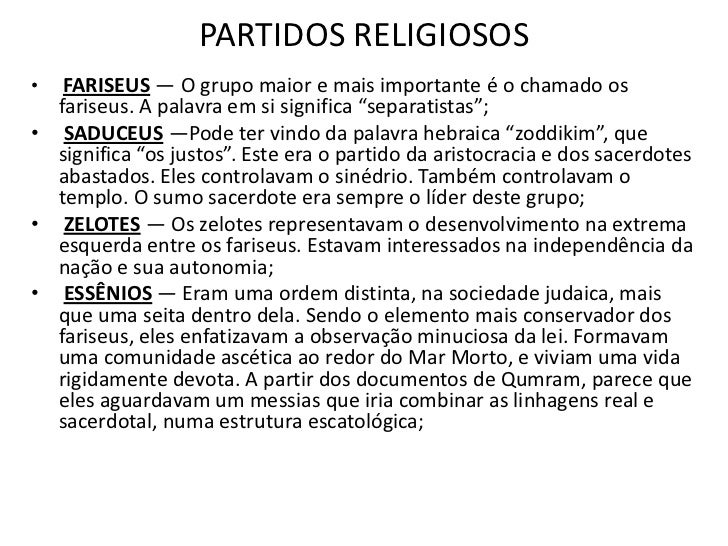 138. 138. PARTIDOS RELIGIOSOS• FARISEUS — O grupo maior e mais importante é o chamado os fariseus. A palavra em si significa “separatistas”;• SADUCEUS —Pode ter vindo da palavra hebraica “zoddikim”, que significa “os justos”. Este era o partido da aristocracia e dos sacerdotes abastados. Eles controlavam o sinédrio. Também controlavam o templo. O sumo sacerdote era sempre o líder deste grupo;• ZELOTES — Os zelotes representavam o desenvolvimento na extrema esquerda entre os fariseus. Estavam interessados na independência da nação e sua autonomia;• ESSÊNIOS — Eram uma ordem distinta, na sociedade judaica, mais que uma seita dentro dela. Sendo o elemento mais conservador dos fariseus, eles enfatizavam a observação minuciosa da lei. Formavam uma comunidade ascética ao redor do Mar Morto, e viviam uma vida rigidamente devota. A partir dos documentos de Qumram, parece que eles aguardavam um messias que iria combinar as linhagens real e sacerdotal, numa estrutura escatológica;