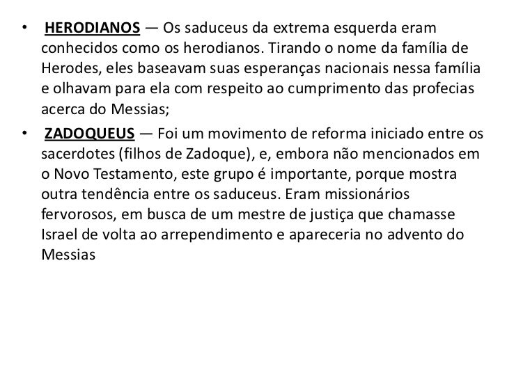 139. 139. • HERODIANOS — Os saduceus da extrema esquerda eram conhecidos como os herodianos. Tirando o nome da família de Herodes, eles baseavam suas esperanças nacionais nessa família e olhavam para ela com respeito ao cumprimento das profecias acerca do Messias;• ZADOQUEUS — Foi um movimento de reforma iniciado entre os sacerdotes (filhos de Zadoque), e, embora não mencionados em o Novo Testamento, este grupo é importante, porque mostra outra tendência entre os saduceus. Eram missionários fervorosos, em busca de um mestre de justiça que chamasse Israel de volta ao arrependimento e apareceria no advento do Messias