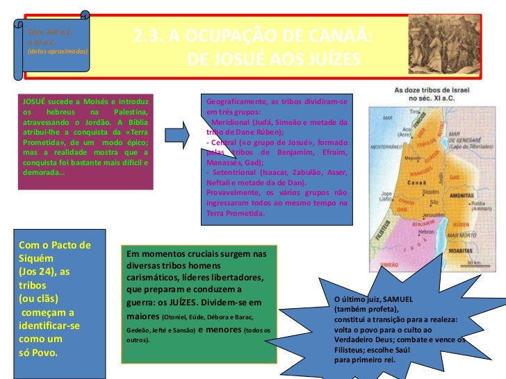 140. 140. Sécs. XIII a.C. a XI a.C. 2.3. A OCUPAÇÃO DE CANAÃ: (datas aproximadas) DE JOSUÉ AOS JUÍZESJOSUÉ sucede a Moisés e introduz Geograficamente, as tribos dividiram-seos hebreus na Palestina, em três grupos:atravessando o Jordão. A Bíblia - Meridional (Judá, Simeão e metade daatribui-lhe a conquista da «Terra tribo de Dane Rúben);Prometida», de um modo épico; - Central («o grupo de Josué», formadomas a realidade mostra que a pelas tribos de Benjamim, Efraim,conquista foi bastante mais difícil e Manassés, Gad);demorada… - Setentrional (Isaacar, Zabulão, Asser, Neftali e metade da de Dan). Provavelmente, os vários grupos não ingressaram todos ao mesmo tempo na Terra Prometida.Com o Pacto deSiquém Em momentos cruciais surgem nas diversas tribos homens(Jos 24), as carismáticos, líderes libertadores,tribos que preparam e conduzem a(ou clãs) guerra: os JUÍZES. Dividem-se em O último juiz, SAMUEL começam a (também profeta), maiores (Otoniel, Eúde, Débora e Barac, constitui a transição para a realeza:identificar-se Gedeão, Jefté e Sansão) e menores (todos os volta o povo para o culto aocomo um outros). Verdadeiro Deus; combate e vence ossó Povo. Filisteus; escolhe Saúl para primeiro rei.