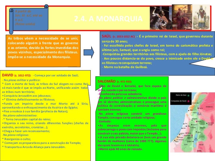 141. 141. A partir do Séc. XI a.C. até ao X a.C. (Reino unido) 2.4. A MONARQUIA As tribos vêem a necessidade de se unir, SAÚL (c. 1033-1012 AC): - É o primeiro rei de Israel, que governou durante cerca de 30 anos; colocando alguém à frente que as governe - Foi escolhido pelos chefes de Israel, em torno do carismático profeta e e as oriente, devido às fortes investidas dos último juiz, Samuel, que o ungiu como rei; povos vizinhos, especialmente dos filisteus. -Conquistou grandes territórios aos filisteus, com a ajuda do filho Jónatas; Impõe-se a necessidade da Monarquia. - Aos poucos distancia-se do povo, cresce a inimizade entre ele e David e os filisteus reconquistam terreno; - Morre na batalha de Guilboá.DAVID (c. 1012-972): - Começa por ser soldado de Saúl;- No plano militar e político: SALOMÃO (c. 972-933):* Com a morte de Saúl, as tribos do Sul elegem-no como Rei; -Filho de David e Betsabé, que fora esposa desó mais tarde é que se impôs ao Norte, unificando assim todas Urias, sucede o pai no trono;as tribos num território; -É conhecido pela sua sabedoria;•Conquista Jerusalém aos jebuseus; -No plano político e administrativo divide o país•* Elimina definitivamente os filisteus; em 12 distritos administrativos e prossegue uma•Funda um império desde o mar Morto até à Síria, política de centralização; o comércio marítimo éaproveitando o enfraquecimento da Assíria e do Egipto; também intenso;•Fixa a realeza à sua família (profecia de Natan); -No plano religioso constrói um grandioso-No plano administrativo: Templo; consegue certa unidade religiosa;-* Torna Jerusalém capital do reino; -Contudo:•Organiza o seu reino, criando diferentes funções (chefes de •As despesas eram enormes, pelo queexército, secretários, cronistas…); sobrecarrega o povo com impostos (inclusive para•Chega a fazer um recenseamento; construir o seu palácio, maior que o Templo…);-No plano religioso: • A sua vida privada deteriora-se (tem um grande* Reorganiza o culto; harém de mulheres (cerca de 1000 ???), algumas* Começam os preparativos para a construção do Templo; das quais levam-no à idolatria;* Transporta a Arca da Aliança para Jerusalém. •Morre após 40 anos de reinado.