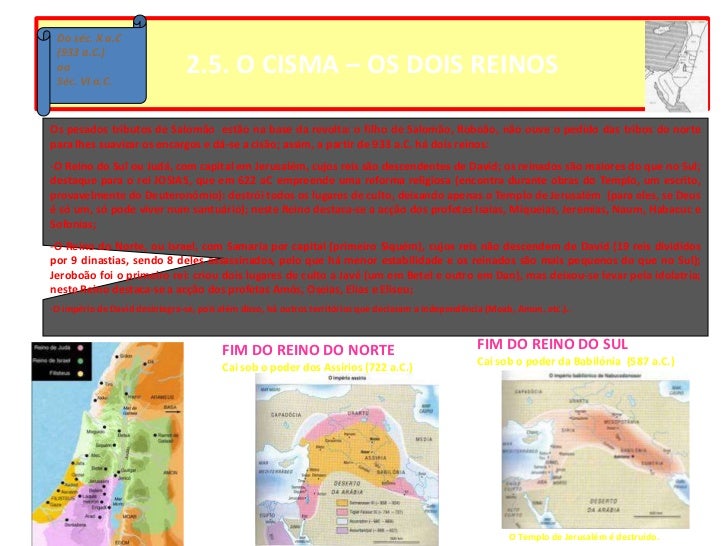 142. 142. Do séc. X a.C (933 a.C.) ao Séc. VI a.C. 2.5. O CISMA – OS DOIS REINOSOs pesados tributos de Salomão estão na base da revolta: o filho de Salomão, Roboão, não ouve o pedido das tribos do nortepara lhes suavizar os encargos e dá-se a cisão; assim, a partir de 933 a.C. há dois reinos:-O Reino do Sul ou Judá, com capital em Jerusalém, cujos reis são descendentes de David; os reinados são maiores do que no Sul;destaque para o rei JOSIAS, que em 622 aC empreende uma reforma religiosa (encontra durante obras do Templo, um escrito,provavelmente do Deuteronómio): destrói todos os lugares de culto, deixando apenas o Templo de Jerusalém (para eles, se Deusé só um, só pode viver num santuário); neste Reino destaca-se a acção dos profetas Isaías, Miqueias, Jeremias, Naum, Habacuc eSofonias;-O Reino do Norte, ou Israel, com Samaria por capital (primeiro Siquém), cujos reis não descendem de David (19 reis divididospor 9 dinastias, sendo 8 deles assassinados, pelo que há menor estabilidade e os reinados são mais pequenos do que no Sul);Jeroboão foi o primeiro rei: criou dois lugares de culto a Javé (um em Betel e outro em Dan), mas deixou-se levar pela idolatria;neste Reino destaca-se a acção dos profetas Amós, Oseias, Elias e Eliseu;-O império de David desintegra-se, pois além disso, há outros territórios que declaram a independência (Moab, Amon, etc.).. FIM DO REINO DO NORTE FIM DO REINO DO SUL Cai sob o poder dos Assírios (722 a.C.) Cai sob o poder da Babilónia (587 a.C.) O Templo de Jerusalém é destruído.