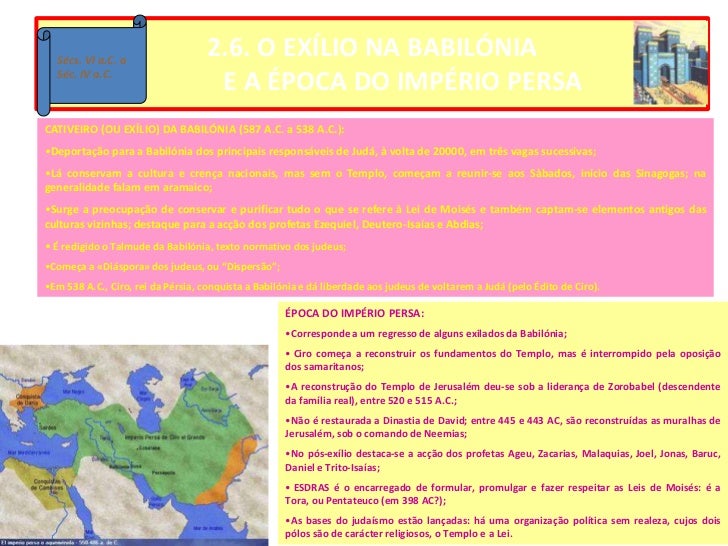 143. 143. Sécs. VI a.C. a 2.6. O EXÍLIO NA BABILÓNIA Séc. IV a.C. E A ÉPOCA DO IMPÉRIO PERSACATIVEIRO (OU EXÍLIO) DA BABILÓNIA (587 A.C. a 538 A.C.):•Deportação para a Babilónia dos principais responsáveis de Judá, à volta de 20000, em três vagas sucessivas;•Lá conservam a cultura e crença nacionais, mas sem o Templo, começam a reunir-se aos Sàbados, início das Sinagogas; nageneralidade falam em aramaico;•Surge a preocupação de conservar e purificar tudo o que se refere à Lei de Moisés e também captam-se elementos antigos dasculturas vizinhas; destaque para a acção dos profetas Ezequiel, Deutero-Isaías e Abdias;• É redigido o Talmude da Babilónia, texto normativo dos judeus;•Começa a «Diáspora» dos judeus, ou “Dispersão”;•Em 538 A.C., Ciro, rei da Pérsia, conquista a Babilónia e dá liberdade aos judeus de voltarem a Judá (pelo Édito de Ciro). ÉPOCA DO IMPÉRIO PERSA: •Corresponde a um regresso de alguns exilados da Babilónia; • Ciro começa a reconstruir os fundamentos do Templo, mas é interrompido pela oposição dos samaritanos; •A reconstrução do Templo de Jerusalém deu-se sob a liderança de Zorobabel (descendente da família real), entre 520 e 515 A.C.; •Não é restaurada a Dinastia de David; entre 445 e 443 AC, são reconstruídas as muralhas de Jerusalém, sob o comando de Neemias; •No pós-exílio destaca-se a acção dos profetas Ageu, Zacarias, Malaquias, Joel, Jonas, Baruc, Daniel e Trito-Isaías; • ESDRAS é o encarregado de formular, promulgar e fazer respeitar as Leis de Moisés: é a Tora, ou Pentateuco (em 398 AC?); •As bases do judaísmo estão lançadas: há uma organização política sem realeza, cujos dois pólos são de carácter religiosos, o Templo e a Lei.