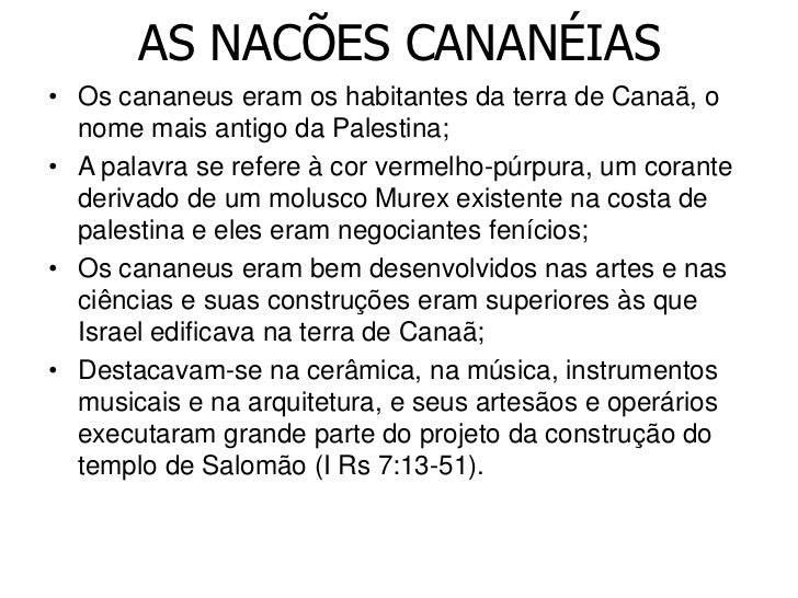 AS NACÕES CANANÉIAS• Os cananeus eram os habitantes da terra de Canaã, o  nome mais antigo da Palestina;• A palavra se ref...