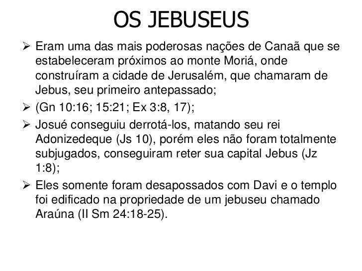 OS JEBUSEUS Eram uma das mais poderosas nações de Canaã que se  estabeleceram próximos ao monte Moriá, onde  construíram ...