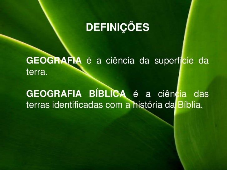 DEFINIÇÕESGEOGRAFIA é a ciência da superfície daterra.GEOGRAFIA BÍBLICA é a ciência dasterras identificadas com a história...
