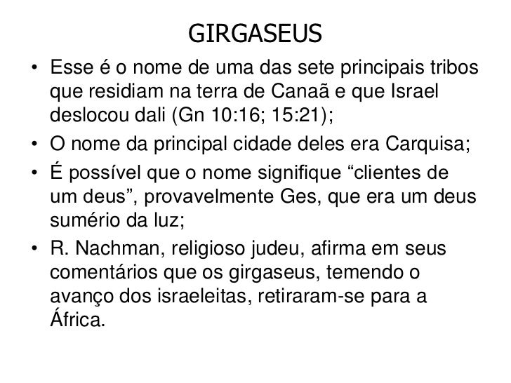 GIRGASEUS• Esse é o nome de uma das sete principais tribos  que residiam na terra de Canaã e que Israel  deslocou dali (Gn...