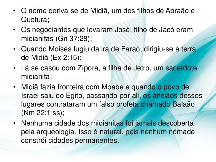 • O nome deriva-se de Midiã, um dos filhos de Abraão e  Quetura;• Os negociantes que levaram José, filho de Jacó eram  mid...