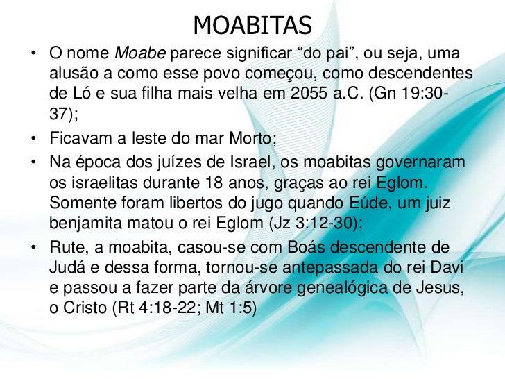 MOABITAS• O nome Moabe parece significar “do pai”, ou seja, uma  alusão a como esse povo começou, como descendentes  de Ló...