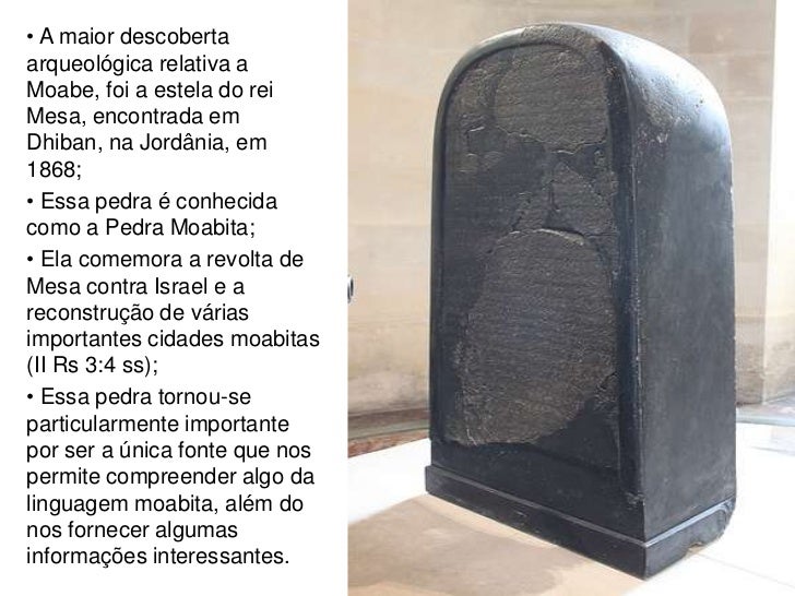 • A maior descobertaarqueológica relativa aMoabe, foi a estela do reiMesa, encontrada emDhiban, na Jordânia, em1868;• Essa...