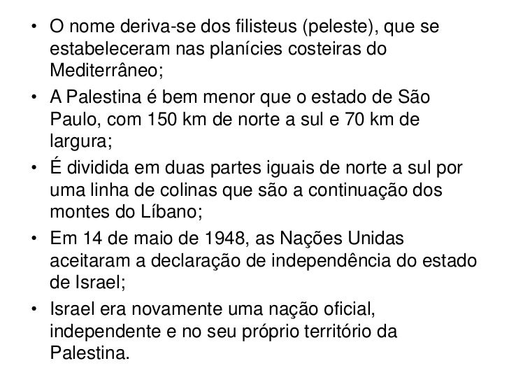 51. 51. • O nome deriva-se dos filisteus (peleste), que se estabeleceram nas planícies costeiras do Mediterrâneo;• A Palestina é bem menor que o estado de São Paulo, com 150 km de norte a sul e 70 km de largura;• É dividida em duas partes iguais de norte a sul por uma linha de colinas que são a continuação dos montes do Líbano;• Em 14 de maio de 1948, as Nações Unidas aceitaram a declaração de independência do estado de Israel;• Israel era novamente uma nação oficial, independente e no seu próprio território da Palestina.