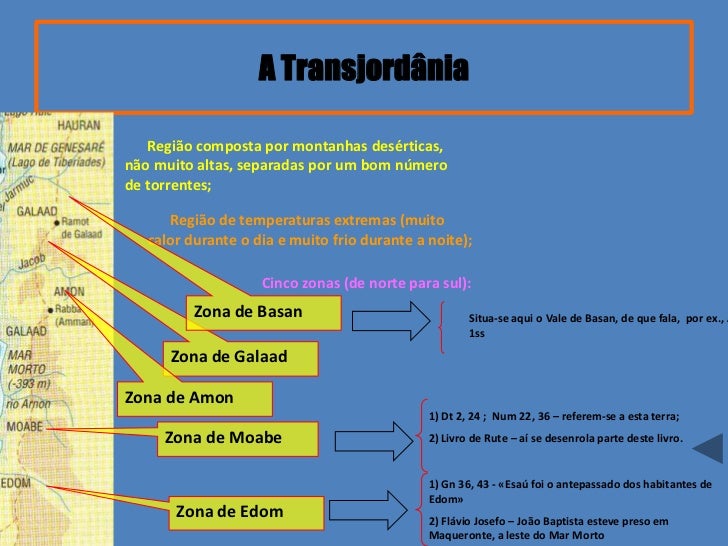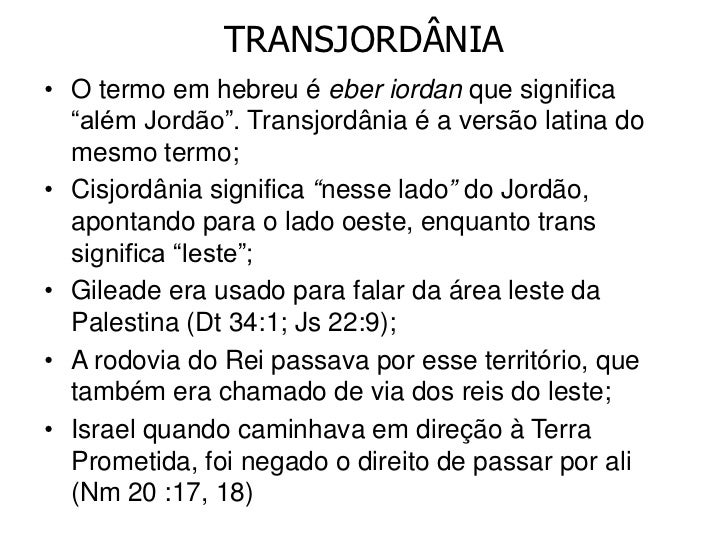57. 57. TRANSJORDÂNIA• O termo em hebreu é eber iordan que significa “além Jordão”. Transjordânia é a versão latina do mesmo termo;• Cisjordânia significa “nesse lado” do Jordão, apontando para o lado oeste, enquanto trans significa “leste”;• Gileade era usado para falar da área leste da Palestina (Dt 34:1; Js 22:9);• A rodovia do Rei passava por esse território, que também era chamado de via dos reis do leste;• Israel quando caminhava em direção à Terra Prometida, foi negado o direito de passar por ali (Nm 20 :17, 18)