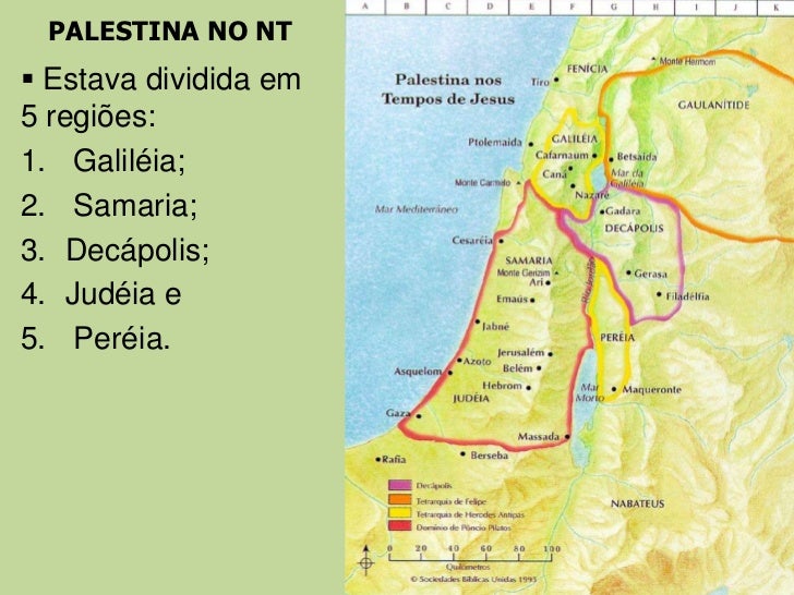PALESTINA NO NT Estava dividida em5 regiões:1. Galiléia;2. Samaria;3. Decápolis;4. Judéia e5. Peréia.