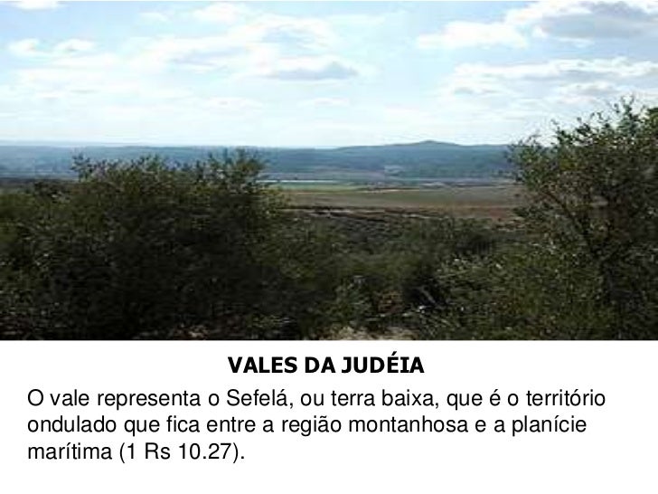 69. 69. VALES DA JUDÉIAO vale representa o Sefelá, ou terra baixa, que é o territórioondulado que fica entre a região montanhosa e a planíciemarítima (1 Rs 10.27).
