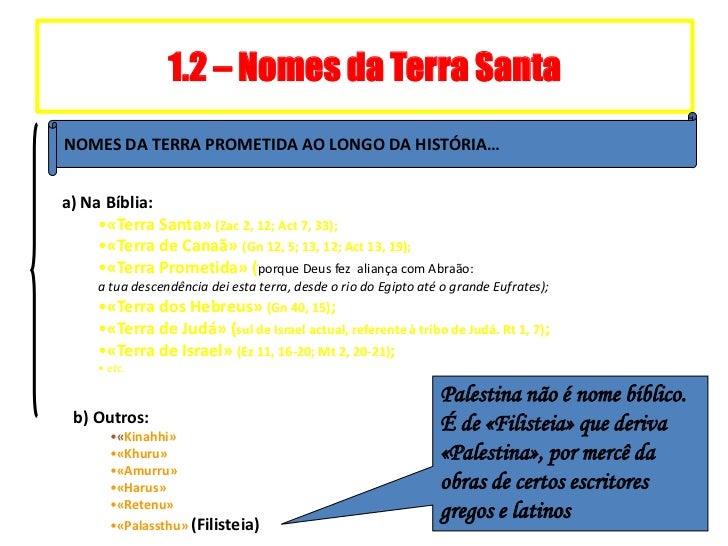 1.2 – Nomes da Terra SantaNOMES DA TERRA PROMETIDA AO LONGO DA HISTÓRIA…a) Na Bíblia:     •«Terra Santa» (Zac 2, 12; Act 7...