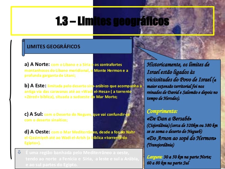 1.3 – Limites geográficos    LIMITES GEOGRÁFICOS   a) A Norte: com o Líbano e a Síria e os contrafortes             Histor...
