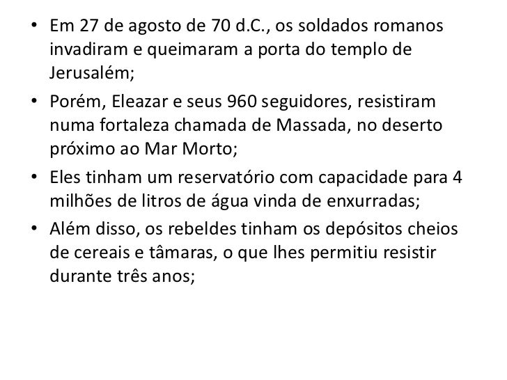 • Em 27 de agosto de 70 d.C., os soldados romanos  invadiram e queimaram a porta do templo de  Jerusalém;• Porém, Eleazar ...