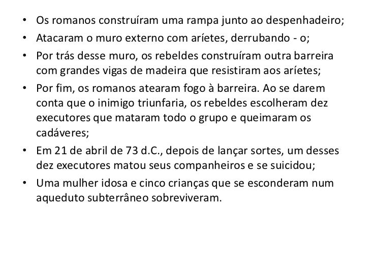 82. 82. • Os romanos construíram uma rampa junto ao despenhadeiro;• Atacaram o muro externo com aríetes, derrubando - o;• Por trás desse muro, os rebeldes construíram outra barreira com grandes vigas de madeira que resistiram aos aríetes;• Por fim, os romanos atearam fogo à barreira. Ao se darem conta que o inimigo triunfaria, os rebeldes escolheram dez executores que mataram todo o grupo e queimaram os cadáveres;• Em 21 de abril de 73 d.C., depois de lançar sortes, um desses dez executores matou seus companheiros e se suicidou;• Uma mulher idosa e cinco crianças que se esconderam num aqueduto subterrâneo sobreviveram.