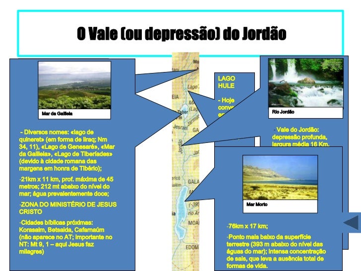 90. 90. O Vale (ou depressão) do Jordão LAGO HULE - Hoje convertido Rio Jordão Mar da Galileia Monte Hermón em «Vale do Hule»; - É uma das nascentes - Diversos nomes: «lago de pouco resta - Vale do Jordão: do lago;quineret» (em forma deno do Jordão, situada liraq; Nm depressão profunda, Líbano;34, 11), «Lago de Genesaré», «Mar largura média 16 Km, -Aqui perto onde corre o Rio Jordãoda Galileia», «Lago de Tiberíades» - 2224 m altitude (tem está cidade desde o Hermón, ao Mar(devido à cidade romana das sempre neve). de Hazor Morto; desce de 329 mmargens em honra de Tibério); (Js 11:10; 1 até 393 m abaixo do-21km x 11 km, prof. máxima de 45 Re 9, 15; 2 mar; afluentesmetros; 212 mt abaixo do nível do Re 15, 29; principais: Jarmuc e omar; água prevalentemente doce; Jr 49:30) Jaboc; comprimento-ZONA DO MINISTÉRIO DE JESUS Mar Morto cerca de 300 kmCRISTO - LOCAL DE BAPTISMO-Cidades bíblicas próximas: DE JESUS CRISTO E -76km x 17 km; PREGAÇÃO DE JOÃOKorasaim, Betsaida, Cafarnaúm(não aparece no AT; importante no BAPTISTA -Ponto mais baixo da superfícieNT: Mt 9, 1 – aqui Jesus faz terrestre (393 m abaixo do nível dasmilagres) águas do mar); intensa concentração de sais, que leva a ausência total de formas de vida.
