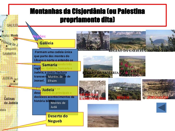 Montanhas da Cisjordânia (ou Palestina        propriamente dita)Regiões:    Galileia                                  NAZA...