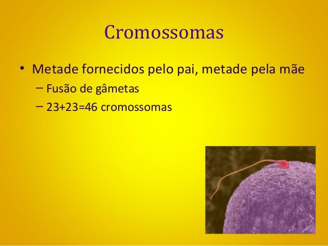10. 10. Cromossomas• Metade fornecidos pelo pai, metade pela mãe– Fusão de gâmetas– 23+23=46 cromossomas