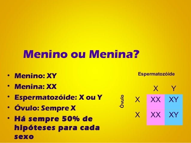 11. 11. Menino ou Menina?• Menino: XY• Menina: XX• Espermatozóide: X ou Y• Óvulo: Sempre X• Há sempre 50% dehipóteses para cadasexoX YX XX XYX XX XYEspermatozóideÓvulo
