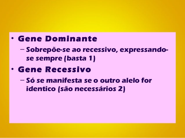 13. 13. Genes: Dominantes ou Recessivos• Gene Dominante– Sobrepõe-se ao recessivo, expressando-se sempre (basta 1)• Gene Recessivo– Só se manifesta se o outro alelo foridentico (são necessários 2)