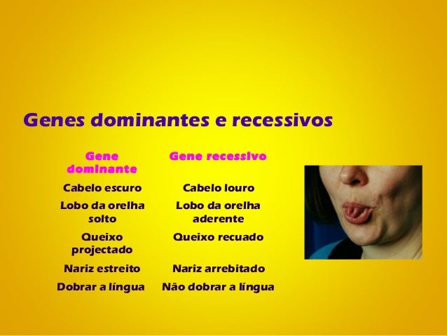 16. 16. Genes dominantes e recessivosGenedominanteGene recessivoCabelo escuro Cabelo louroLobo da orelhasoltoLobo da orelhaaderenteQueixoprojectadoQueixo recuadoNariz estreito Nariz arrebitadoDobrar a língua Não dobrar a língua