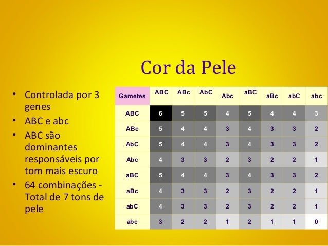 19. 19. Cor da Pele• Controlada por 3genes• ABC e abc• ABC sãodominantesresponsáveis portom mais escuro• 64 combinações -Total de 7 tons depeleGametes ABC  ABc  AbC  Abc  aBC  aBc   abC   abc ABC 6 5 5 4 5 4 4 3ABc 5 4 4 3 4 3 3 2AbC 5 4 4 3 4 3 3 2Abc 4 3 3 2 3 2 2 1aBC 5 4 4 3 4 3 3 2aBc 4 3 3 2 3 2 2 1abC 4 3 3 2 3 2 2 1abc 3 2 2 1 2 1 1 0