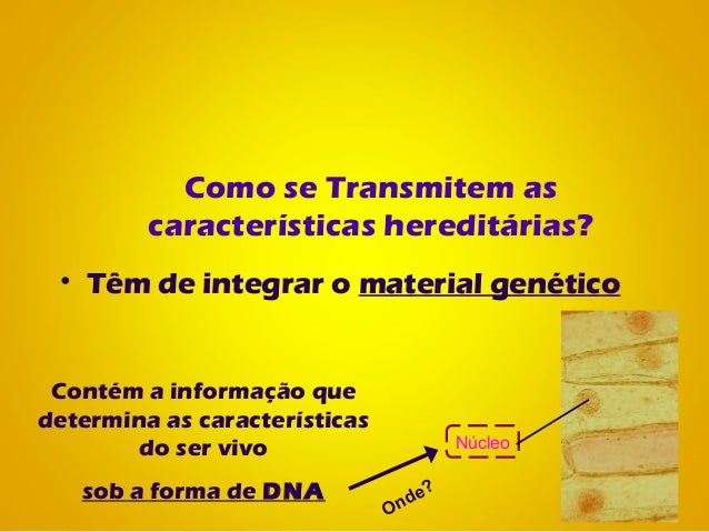 4. 4. Como se Transmitem ascaracterísticas hereditárias?• Têm de integrar o material genéticoContém a informação quedetermina as característicasdo ser vivosob a forma de DNAOnde?Núcleo