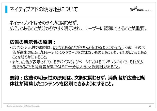 広告の明示性に関しては、消費者が媒体社によるコンテンツとネイティブアドを文脈に関わらず区別可能であるべき。