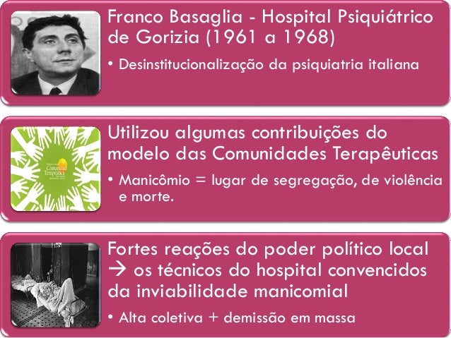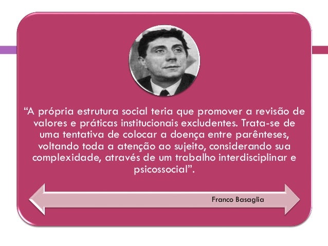 10. 10. “A própria estrutura social teria que promover a revisão de valores e práticas institucionais excludentes. Trata-se de uma tentativa de colocar a doença entre parênteses, voltando toda a atenção ao sujeito, considerando sua complexidade, através de um trabalho interdisciplinar e psicossocial”. Franco Basaglia