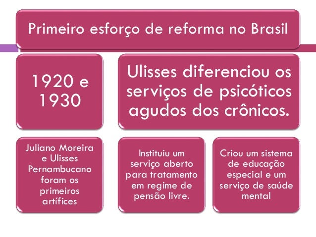 11. 11. Primeiro esforço de reforma no Brasil 1920 e 1930 Juliano Moreira e Ulisses Pernambucano foram os primeiros artífices Ulisses diferenciou os serviços de psicóticos agudos dos crônicos. Instituiu um serviço aberto para tratamento em regime de pensão livre. Criou um sistema de educação especial e um serviço de saúde mental