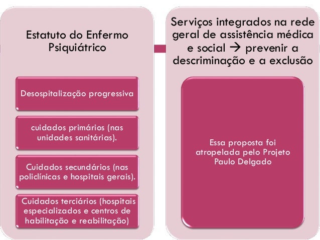 13. 13. Estatuto do Enfermo Psiquiátrico Desospitalização progressiva cuidados primários (nas unidades sanitárias). Cuidados secundários (nas policlínicas e hospitais gerais). Cuidados terciários (hospitais especializados e centros de habilitação e reabilitação) Serviços integrados na rede geral de assistência médica e social  prevenir a descriminação e a exclusão Essa proposta foi atropelada pelo Projeto Paulo Delgado