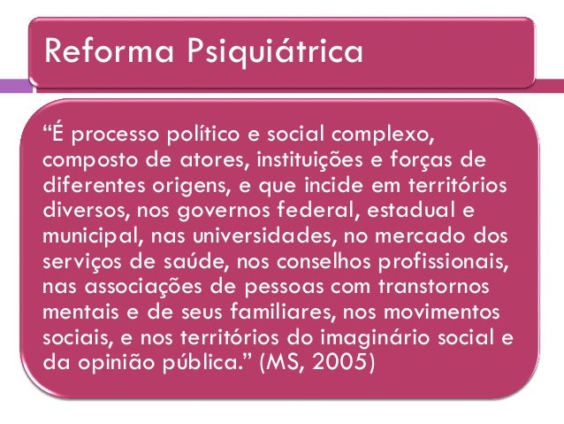 14. 14. “É processo político e social complexo, composto de atores, instituições e forças de diferentes origens, e que incide em territórios diversos, nos governos federal, estadual e municipal, nas universidades, no mercado dos serviços de saúde, nos conselhos profissionais, nas associações de pessoas com transtornos mentais e de seus familiares, nos movimentos sociais, e nos territórios do imaginário social e da opinião pública.” (MS, 2005) Reforma Psiquiátrica