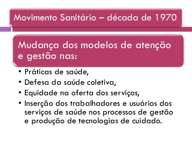 15. 15. Mudança dos modelos de atenção e gestão nas: • Práticas de saúde, • Defesa da saúde coletiva, • Equidade na oferta dos serviços, • Inserção dos trabalhadores e usuários dos serviços de saúde nos processos de gestão e produção de tecnologias de cuidado. Movimento Sanitário – década de 1970