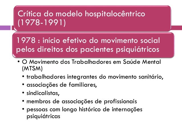 16. 16. 1978 : início efetivo do movimento social pelos direitos dos pacientes psiquiátricos • O Movimento dos Trabalhadores em Saúde Mental (MTSM) • trabalhadores integrantes do movimento sanitário, • associações de familiares, • sindicalistas, • membros de associações de profissionais • pessoas com longo histórico de internações psiquiátricas Crítica do modelo hospitalocêntrico (1978-1991)