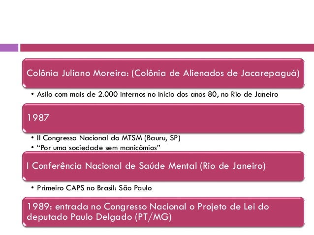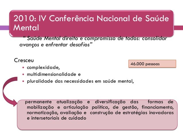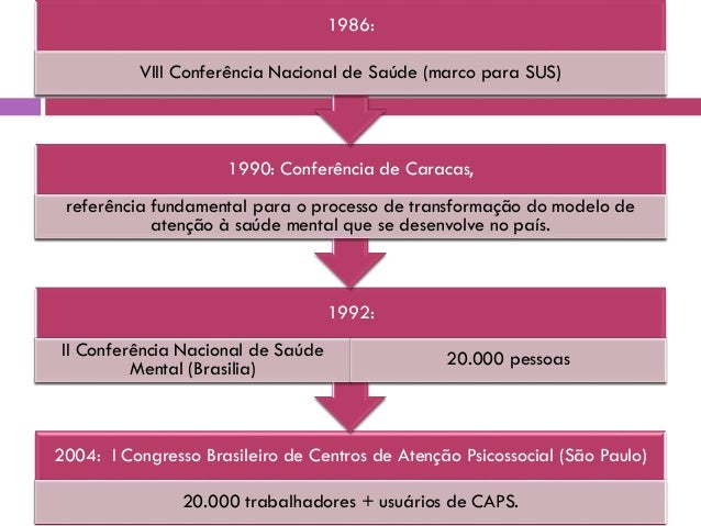 22. 22. 2004: I Congresso Brasileiro de Centros de Atenção Psicossocial (São Paulo) 20.000 trabalhadores + usuários de CAPS. 1992: II Conferência Nacional de Saúde Mental (Brasilia) 20.000 pessoas 1990: Conferência de Caracas, referência fundamental para o processo de transformação do modelo de atenção à saúde mental que se desenvolve no país. 1986: VIII Conferência Nacional de Saúde (marco para SUS)