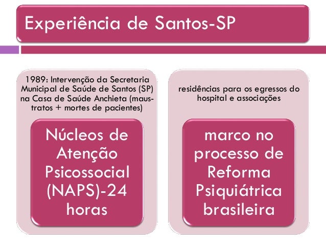 20. 20. 1989: Intervenção da Secretaria Municipal de Saúde de Santos (SP) na Casa de Saúde Anchieta (maus- tratos + mortes de pacientes) Núcleos de Atenção Psicossocial (NAPS)-24 horas residências para os egressos do hospital e associações marco no processo de Reforma Psiquiátrica brasileira Experiência de Santos-SP