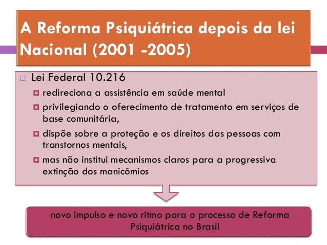 24. 24.  Lei Federal 10.216  redireciona a assistência em saúde mental  privilegiando o oferecimento de tratamento em serviços de base comunitária,  dispõe sobre a proteção e os direitos das pessoas com transtornos mentais,  mas não institui mecanismos claros para a progressiva extinção dos manicômios novo impulso e novo ritmo para o processo de Reforma Psiquiátrica no Brasil