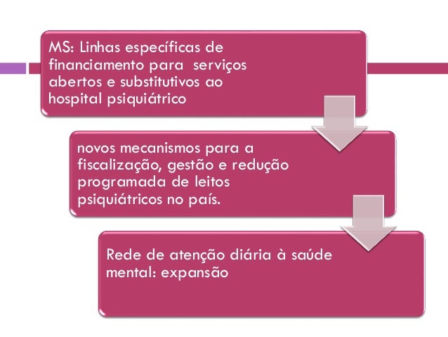 25. 25. MS: Linhas específicas de financiamento para serviços abertos e substitutivos ao hospital psiquiátrico novos mecanismos para a fiscalização, gestão e redução programada de leitos psiquiátricos no país. Rede de atenção diária à saúde mental: expansão