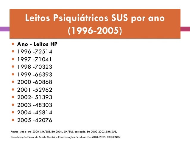 26. 26. Fontes : Até o ano 2000, SIH/SUS. Em 2001, SIH/SUS, corrigido. Em 2002-2003, SIH/SUS, Coordenação Geral de Saúde Mental e Coordenações Estaduais. Em 2004-2005, PRH/CNES.  Ano - Leitos HP  1996 -72514  1997 -71041  1998 -70323  1999 -66393  2000 -60868  2001 -52962  2002- 51393  2003 -48303  2004 -45814  2005 -42076