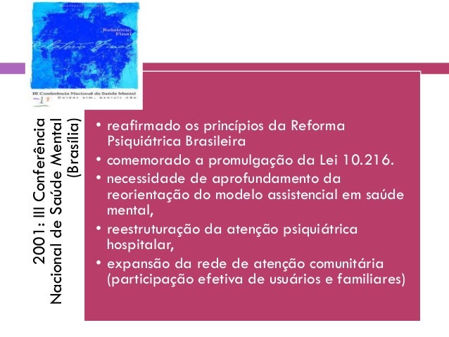 27. 27. 2001:IIIConferência NacionaldeSaúdeMental (Brasília) • reafirmado os princípios da Reforma Psiquiátrica Brasileira • comemorado a promulgação da Lei 10.216. • necessidade de aprofundamento da reorientação do modelo assistencial em saúde mental, • reestruturação da atenção psiquiátrica hospitalar, • expansão da rede de atenção comunitária (participação efetiva de usuários e familiares)