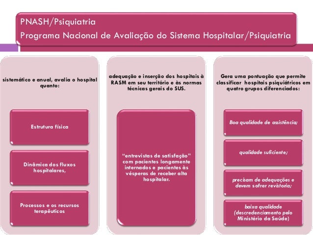 28. 28. sistemático e anual, avalia o hospital quanto: Estrutura física Dinâmica dos fluxos hospitalares, Processos e os recursos terapêuticos adequação e inserção dos hospitais à RASM em seu território e às normas técnicas gerais do SUS. “entrevistas de satisfação” com pacientes longamente internados e pacientes às vésperas de receber alta hospitalar. Gera uma pontuação que permite classificar hospitais psiquiátricos em quatro grupos diferenciados: Boa qualidade de assistência; qualidade suficiente; precisam de adequações e devem sofrer revistoria; baixa qualidade (descredenciamento pelo Ministério da Saúde) PNASH/Psiquiatria Programa Nacional de Avaliação do Sistema Hospitalar/Psiquiatria