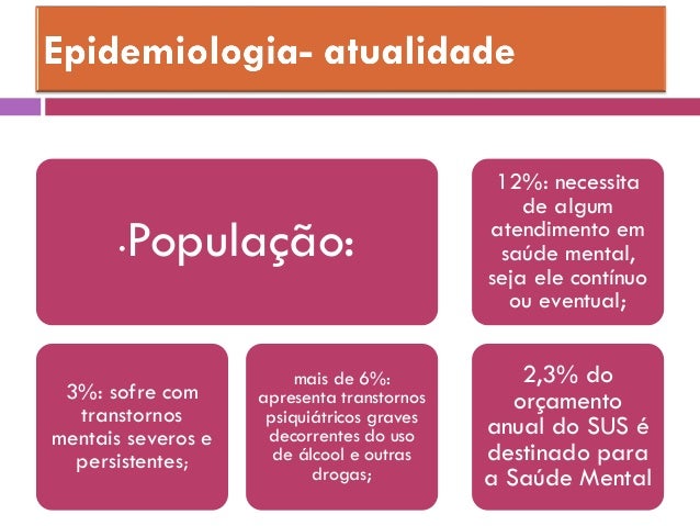 3. 3. •População: 3%: sofre com transtornos mentais severos e persistentes; mais de 6%: apresenta transtornos psiquiátricos graves decorrentes do uso de álcool e outras drogas; 12%: necessita de algum atendimento em saúde mental, seja ele contínuo ou eventual; 2,3% do orçamento anual do SUS é destinado para a Saúde Mental