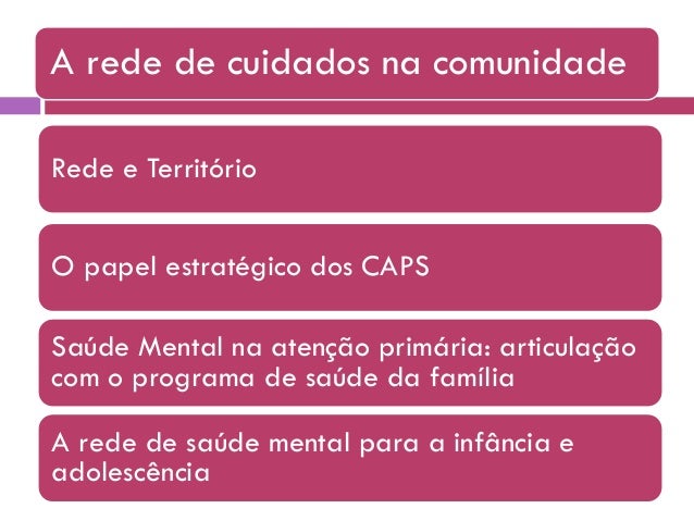 30. 30. A rede de cuidados na comunidade Rede e Território O papel estratégico dos CAPS Saúde Mental na atenção primária: articulação com o programa de saúde da família A rede de saúde mental para a infância e adolescência